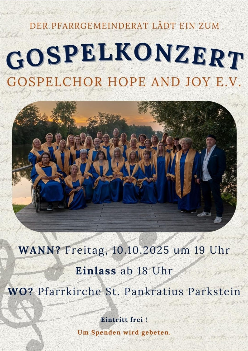 10.10.2025 Der Pfarrgemeinderat Parkstein lädt ein: Gospelkonzert in der Pankratius-Kirche Parkstein - Einlass ab 18:00 Uhr - ab 19:00 Uhr Konzert